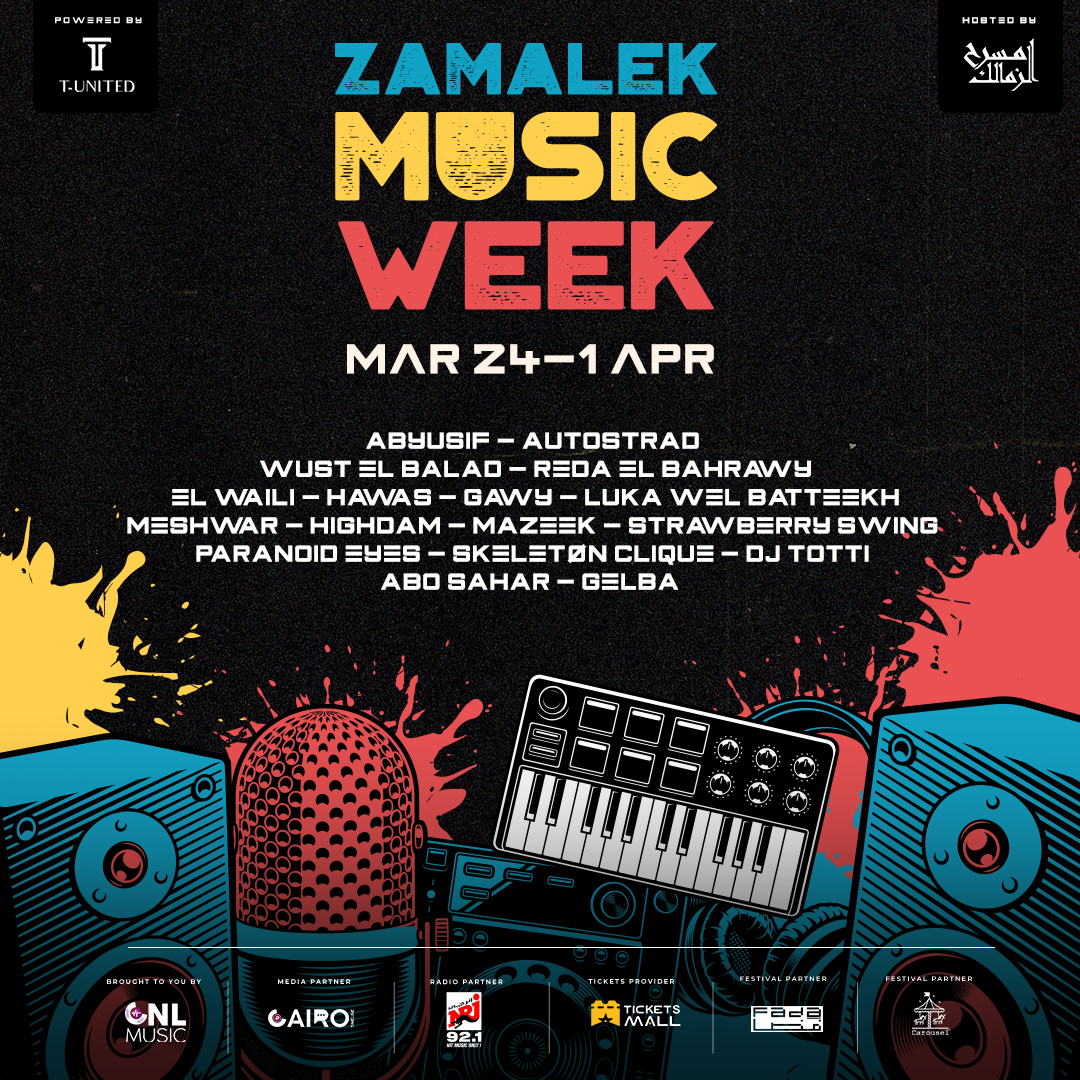 مسرح الزمالك عامل ملحمة من المزيكا، ١٧ فرقة ومطرب في ٨ حفلات بألوان موسيقية متنوعة. وإحنا بنقولك ليه لازم متفوتش إسبوع زي ده.